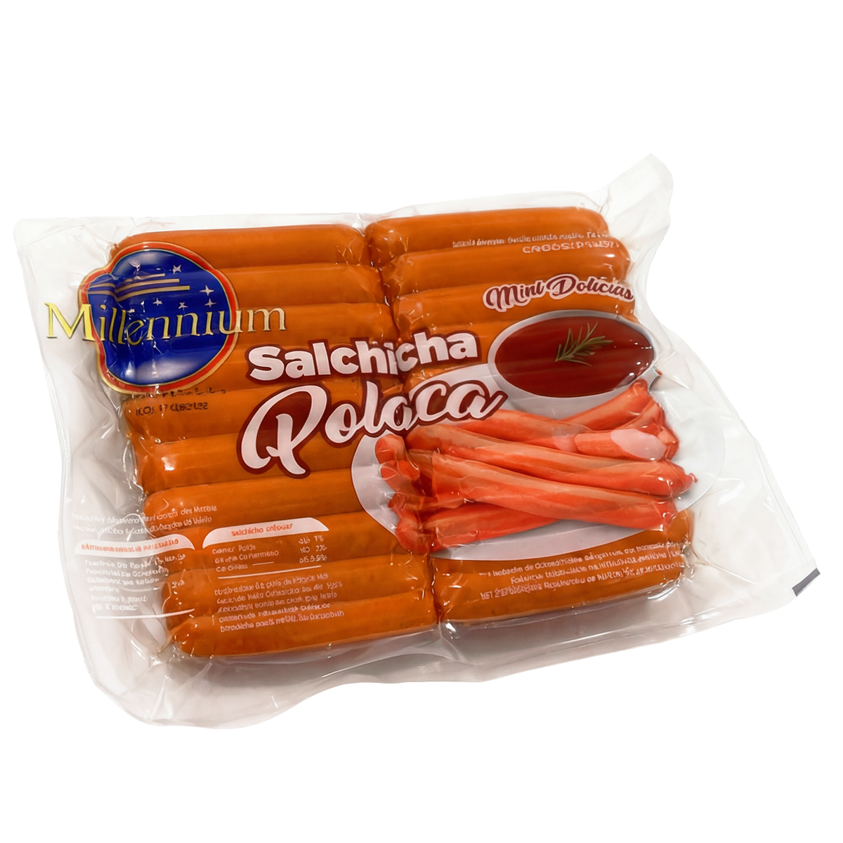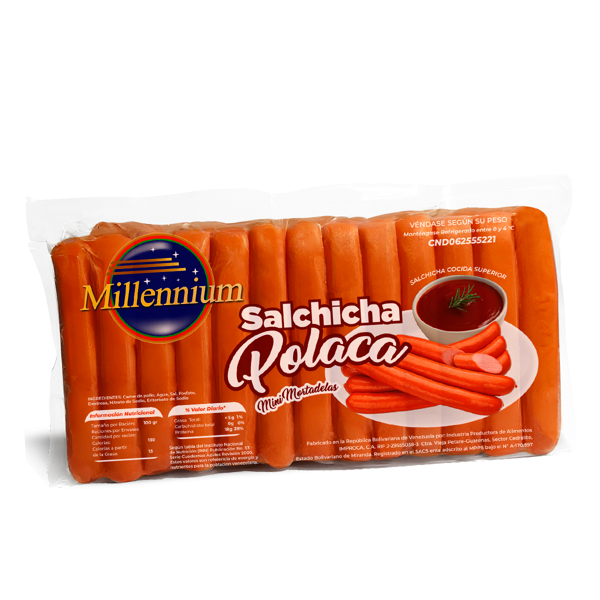 Salchicha de pollo tipo polaca cortada en trozos tipo cóctel.